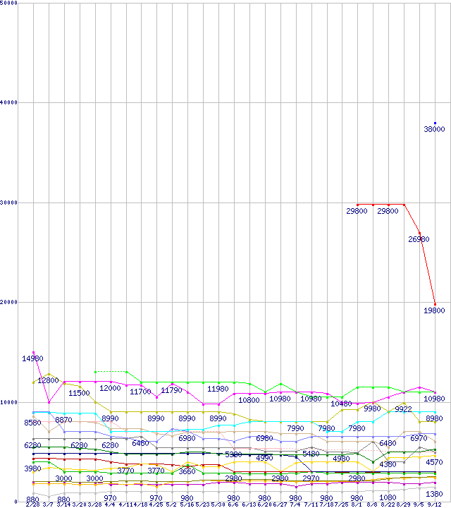 メモリ主要製品の最安値推移↑前グラフ↓次グラフ(2009年2月28日〜2009年9月12日)※このグラフは過去のデータも税率5%相当に調整した税込み相当額のグラフです。 税率変更や、総額表示方式導入(2004年4月)の影響は除いています。凡例PC3-10600 4GB×2枚組みセットPC3-10600 4GBPC2-6400 4GBPC3-12800 2GB×3枚組みセットPC3-10600 2GB×3枚組みセットPC3-12800 2GB×2枚組みセットPC3-10600 2GB×2枚組みセットPC3-12800 1GB×3枚組みセットPC3-10600 1GB×3枚組みセットPC3-12800 2GBPC3-12800 1GB×2枚組みセットPC2-6400 2GB×2枚組みセットPC3-12800 1GBPC3-10600 1GB×2枚組みセットPC3-10600 2GBPC2-6400 1GB×2枚組みセットPC2-6400 2GBPC3-10600 1GBPC2-6400 1GB※製品名をクリックすると個別のグラフを表示します※点線部は販売店が確認できなかった、または調査データがないことを示します