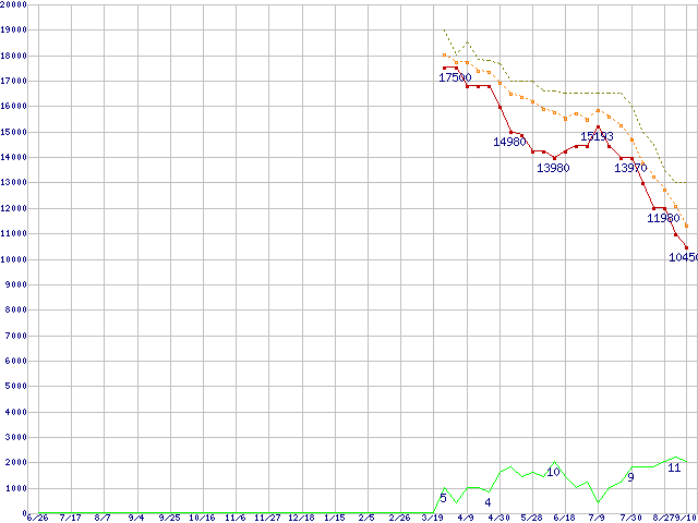 WD15EADS (1.5TB,32MB)の価格推移↑前グラフ↓次グラフ(2008年6月26日〜2009年9月10日)※このグラフは過去のデータも税率5%相当に調整した税込み相当額のグラフです。 税率変更や、総額表示方式導入(2004年4月)の影響は除いています。●関連グラフHDD/SSD主要製品の最安値推移HDD/SSD主要製品(最安値1万円〜1万5千円未満)の最安値推移HDD 1.5TB〜2TB未満の最安値推移WD Caviar Green (3Gb/s)の最安値推移●凡例最安値(点線部は販売店未確認または未調査)平均値最高値ショップ数