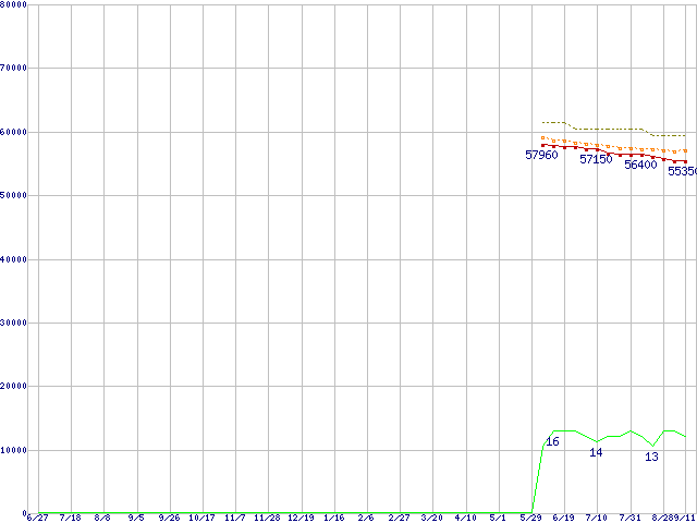 Core i7-950 (3.06GHz)の価格推移↑前グラフ↓次グラフ(2008年6月27日〜2009年9月11日)※このグラフは過去のデータも税率5%相当に調整した税込み相当額のグラフです。 税率変更や、総額表示方式導入(2004年4月)の影響は除いています。●関連グラフCPU主要製品の最安値推移CPU主要製品(最安値3万円〜6万円未満)の最安値推移Intel系CPUの最安値推移LGA1366 (QPI 4.8GT/s,L3キャッシュ8MB,Quad Core,Hyper-Threading)の最安値推移●凡例最安値(点線部は販売店未確認または未調査)平均値最高値ショップ数