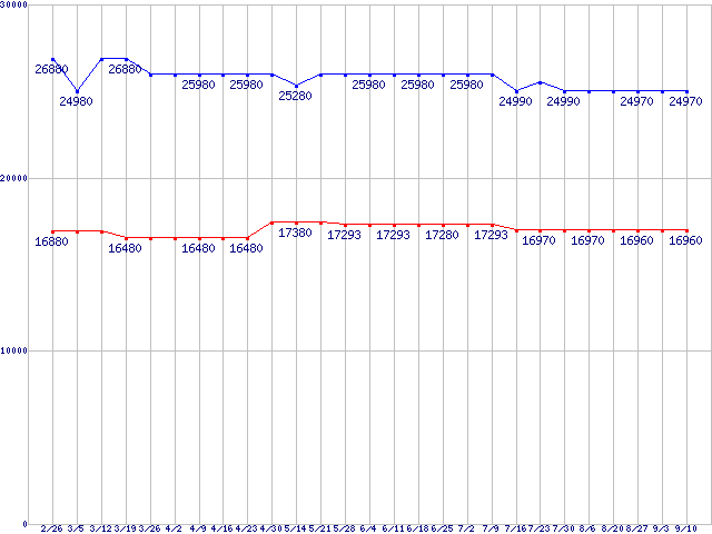 | WD VelociRaptor (10000rpm,3Gb/s,16MB)の最安値推移 |