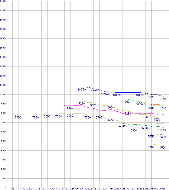 CPU主要製品(最安値1万円未満)の最安値推移↑前グラフ↓次グラフ(2009年3月6日〜2009年9月18日)※このグラフは過去のデータも税率5%相当に調整した税込み相当額のグラフです。 税率変更や、総額表示方式導入(2004年4月)の影響は除いています。凡例Phenom II X2 550 Black Edition (3.1GHz,L2 512KB×2,L3 6MB)Pentium Dual-Core E6500 (2.93GHz,L2 2MB)Phenom II X2 545 (3.0GHz,L2 512KB×2,L3 6MB)Pentium Dual-Core E6300 (2.8GHz,L2 2MB)Athlon II X2 240e (2.8GHz,L2 1MB×2,TDP 45W)Athlon II X2 250 (3.0GHz,L2 1MB×2,TDP 65W)Athlon II X2 235e (2.7GHz,L2 1MB×2,TDP 45W)Pentium Dual-Core E5300 (2.6GHz,L2 2MB)Athlon II X2 245 (2.9GHz,L2 1MB×2,TDP 65W)Athlon II X2 240 (2.8GHz,L2 1MB×2,TDP 65W)Celeron E3300 (2.5GHz)Celeron E3200 (2.4GHz)※製品名をクリックすると個別のグラフを表示します※点線部は販売店が確認できなかった、または調査データがないことを示します