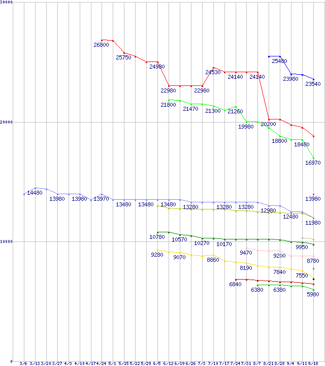 AMD系CPUの最安値推移↑前グラフ↓次グラフ(2009年3月6日〜2009年9月18日)※このグラフは過去のデータも税率5%相当に調整した税込み相当額のグラフです。 税率変更や、総額表示方式導入(2004年4月)の影響は除いています。凡例Phenom II X4 965 Black Edition (3.4GHz,L2 512KB×4,L3 6MB,TDP 140W)Phenom II X4 955 Black Edition (3.2GHz,L2 512KB×4,L3 6MB,TDP 125W)Phenom II X4 945 (3.0GHz,L2 512KB×4,L3 6MB,TDP 95W)Athlon II X4 605e (2.3GHz,L2 512KB×4,TDP 45W)Athlon II X4 630 (2.8GHz,L2 512KB×4,TDP 95W)Phenom II X3 705e (2.5GHz,L2 512KB×3,L3 6MB,TDP 65W)Phenom II X3 720 Black Edition (2.8GHz,L2 512KB×3,L3 6MB,TDP 95W)Athlon II X4 620 (2.6GHz,L2 512KB×4,TDP 95W)Phenom II X2 550 Black Edition (3.1GHz,L2 512KB×2,L3 6MB)Phenom II X2 545 (3.0GHz,L2 512KB×2,L3 6MB)Athlon II X2 240e (2.8GHz,L2 1MB×2,TDP 45W)Athlon II X2 250 (3.0GHz,L2 1MB×2,TDP 65W)Athlon II X2 235e (2.7GHz,L2 1MB×2,TDP 45W)Athlon II X2 245 (2.9GHz,L2 1MB×2,TDP 65W)Athlon II X2 240 (2.8GHz,L2 1MB×2,TDP 65W)※製品名をクリックすると個別のグラフを表示します※点線部は販売店が確認できなかった、または調査データがないことを示します