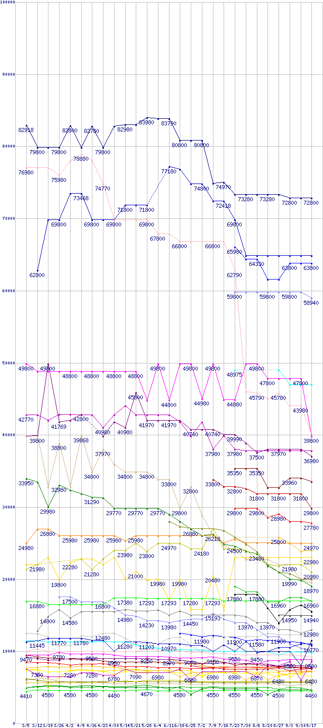 HDD/SSD主要製品の最安値推移↑前グラフ↓次グラフ(2009年3月5日〜2009年9月17日)※このグラフは過去のデータも税率5%相当に調整した税込み相当額のグラフです。 税率変更や、総額表示方式導入(2004年4月)の影響は除いています。凡例SSDSA2SH064G1C5 (64GB,SLC)OCZSSD2-1VTX250G (250GB,64MB,MLC)2.5インチSSD(SAMSUNG製コントローラ) 256GB (256GB,MLC)2.5インチSSD(INDILINX製コントローラ) 256GB (256GB,MLC)SDSA2MH160G2C1/R1/R5 (160GB,MLC)SSDSA2MH160G1C5 (160GB,MLC)2.5インチSSD 256GB (256GB,MLC)SSDSA2SH032G1 (32GB,SLC)OCZSSD2-1VTX120G (120GB,64MB,MLC)2.5インチSSD(SAMSUNG製コントローラ) 128GB (128GB,MLC)WD2002FYPS (2TB,64MB)2.5インチSSD(INDILINX製コントローラ) 128GB (128GB,MLC)WD3000HLFS (300.0GB)SDSA2MH80G2C1/R1/R5 (80GB,MLC)2.5インチSSD 128GB (128GB,MLC)HDS722020ALA330 (2TB,32MB)OCZSSD2-1VTX60G (60GB,64MB,MLC)ST32000542AS (2TB,32MB)SSDSA2MH080G1C5 (80GB,MLC)WD20EADS (2TB,32MB)2.5インチSSD(SAMSUNG製コントローラ) 64GB (64GB,MLC)WD1500HLFS (150.0GB)2.5インチSSD(INDILINX製コントローラ) 64GB (64GB,MLC)WD7500KEVT (750GB,8MB,12.5mm厚)OCZSSD2-1VTX30G (30GB,64MB,MLC)2.5インチSSD 64GB (64GB,MLC)2.5インチSSD(INDILINX製コントローラ) 32GB (32GB,MLC)ST31500341AS (1.5TB,32MB)ST31500541AS (1.5TB,32MB)WD15EADS (1.5TB,32MB)HD154UI (1.5TB,32MB)WD1001FALS (1TB,32MB)ST9500325AS (500GB,8MB)2.5インチSSD 32GB (32GB,MLC)WD5000BEVT (500GB,8MB)HTS545050B9A300 (500GB,8MB)HM500JI (500GB,8MB)ST31000528AS (1TB,32MB)ST31000520AS (1TB,32MB)HDT721010SLA360 (1TB,16MB)WD10EADS (1TB,32MB)HD103SI (1TB,32MB)WD6400AAKS (640GB)WD3200BEVT (320GB,8MB)HTS545032B9A300 (320GB,8MB)HDP725050GLA360 (500GB,16MB)ST3500418AS (500GB,16MB)HD502HI (500GB,16MB)※製品名をクリックすると個別のグラフを表示します※点線部は販売店が確認できなかった、または調査データがないことを示します