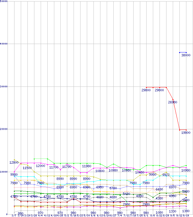 メモリ主要製品の最安値推移↑前グラフ↓次グラフ(2009年3月7日〜2009年9月19日)※このグラフは過去のデータも税率5%相当に調整した税込み相当額のグラフです。 税率変更や、総額表示方式導入(2004年4月)の影響は除いています。凡例PC3-10600 4GB×2枚組みセットPC3-10600 4GBPC2-6400 4GBPC3-12800 2GB×3枚組みセットPC3-10600 2GB×3枚組みセットPC3-12800 2GB×2枚組みセットPC3-10600 2GB×2枚組みセットPC3-12800 1GB×3枚組みセットPC3-10600 1GB×3枚組みセットPC3-12800 1GB×2枚組みセットPC2-6400 2GB×2枚組みセットPC3-12800 2GBPC3-10600 1GB×2枚組みセットPC3-10600 2GBPC3-12800 1GBPC2-6400 1GB×2枚組みセットPC2-6400 2GBPC3-10600 1GBPC2-6400 1GB※製品名をクリックすると個別のグラフを表示します※点線部は販売店が確認できなかった、または調査データがないことを示します