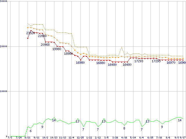 WD1500HLFS (150.0GB)の価格推移↑前グラフ↓次グラフ(2008年7月3日〜2009年9月17日)※このグラフは過去のデータも税率5%相当に調整した税込み相当額のグラフです。 税率変更や、総額表示方式導入(2004年4月)の影響は除いています。●関連グラフHDD/SSD主要製品の最安値推移HDD/SSD主要製品(最安値1万5千円〜2万円未満)の最安値推移HDD 100〜160GB未満の最安値推移WD VelociRaptor (10000rpm,3Gb/s,16MB)の最安値推移●凡例最安値(点線部は販売店未確認または未調査)平均値最高値ショップ数