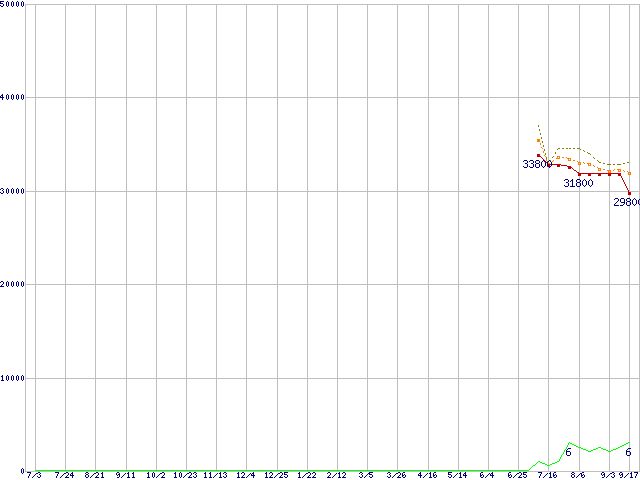 WD2002FYPS (2TB,64MB)の価格推移↑前グラフ↓次グラフ(2008年7月3日〜2009年9月17日)※このグラフは過去のデータも税率5%相当に調整した税込み相当額のグラフです。 税率変更や、総額表示方式導入(2004年4月)の影響は除いています。●関連グラフHDD/SSD主要製品の最安値推移HDD/SSD主要製品(最安値2万円以上)の最安値推移HDD 2TB以上の最安値推移WD RE4-GP (3Gb/s,64MB)の最安値推移●凡例最安値(点線部は販売店未確認または未調査)平均値最高値ショップ数