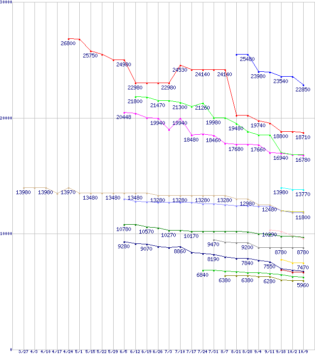 AMD系CPUの最安値推移↑前グラフ↓次グラフ(2009年3月27日〜2009年10月9日)※このグラフは過去のデータも税率5%相当に調整した税込み相当額のグラフです。 税率変更や、総額表示方式導入(2004年4月)の影響は除いています。凡例Phenom II X4 965 Black Edition (3.4GHz,L2 512KB×4,L3 6MB,TDP 140W)Phenom II X4 955 Black Edition (3.2GHz,L2 512KB×4,L3 6MB,TDP 125W)Phenom II X4 945 (3.0GHz,L2 512KB×4,L3 6MB,TDP 95W)Phenom II X4 905e (2.5GHz,L2 512KB×4,L3 6MB,TDP 65W)Athlon II X4 605e (2.3GHz,L2 512KB×4,TDP 45W)Athlon II X4 630 (2.8GHz,L2 512KB×4,TDP 95W)Phenom II X3 705e (2.5GHz,L2 512KB×3,L3 6MB,TDP 65W)Phenom II X3 720 Black Edition (2.8GHz,L2 512KB×3,L3 6MB,TDP 95W)Phenom II X2 550 Black Edition (3.1GHz,L2 512KB×2,L3 6MB)Athlon II X4 620 (2.6GHz,L2 512KB×4,TDP 95W)Phenom II X2 545 (3.0GHz,L2 512KB×2,L3 6MB)Athlon II X2 240e (2.8GHz,L2 1MB×2,TDP 45W)Athlon II X2 250 (3.0GHz,L2 1MB×2,TDP 65W)Athlon II X2 235e (2.7GHz,L2 1MB×2,TDP 45W)Athlon II X2 245 (2.9GHz,L2 1MB×2,TDP 65W)Athlon II X2 240 (2.8GHz,L2 1MB×2,TDP 65W)※製品名をクリックすると個別のグラフを表示します※点線部は販売店が確認できなかった、または調査データがないことを示します