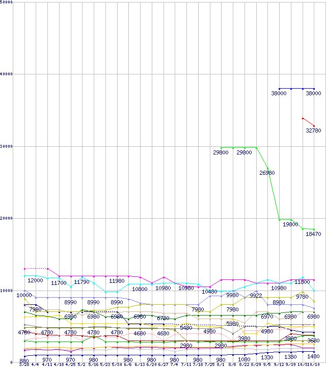 メモリ主要製品の最安値推移↑前グラフ↓次グラフ(2009年3月28日〜2009年10月10日)※このグラフは過去のデータも税率5%相当に調整した税込み相当額のグラフです。 税率変更や、総額表示方式導入(2004年4月)の影響は除いています。凡例PC3-10600 4GB×2枚組みセットPC2-6400 4GB×2枚組みセットPC3-10600 4GBPC2-6400 4GBPC3-12800 2GB×3枚組みセットPC3-10600 2GB×3枚組みセットPC3-12800 2GB×2枚組みセットPC3-12800 1GB×3枚組みセットPC3-10600 2GB×2枚組みセットPC2-6400 2GB×2枚組みセットPC3-10600 1GB×3枚組みセットPC3-12800 1GB×2枚組みセットPC3-12800 2GBPC3-10600 1GB×2枚組みセットPC3-10600 2GBPC3-12800 1GBPC2-6400 1GB×2枚組みセットPC2-6400 2GBPC3-10600 1GBPC2-6400 1GB※製品名をクリックすると個別のグラフを表示します※点線部は販売店が確認できなかった、または調査データがないことを示します