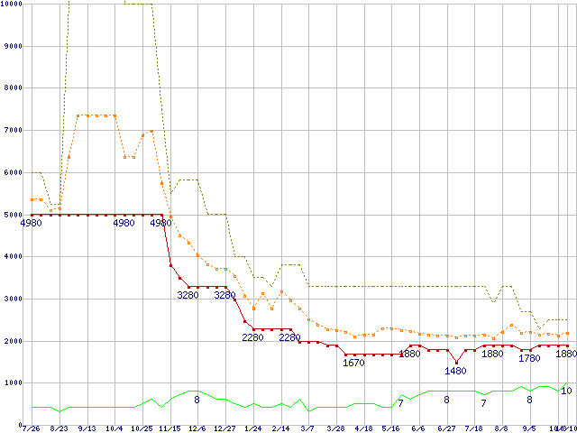 PC3-10600 1GBの価格推移↓次グラフ(2008年7月26日〜2009年10月10日)※このグラフは過去のデータも税率5%相当に調整した税込み相当額のグラフです。 税率変更や、総額表示方式導入(2004年4月)の影響は除いています。●関連グラフメモリ主要製品の最安値推移1GBモジュールの最安値推移メモリ主要製品(最安値5千円未満)の最安値推移PC3-10600(DDR3-1333) DDR3 SDRAM DIMMの最安値推移●凡例最安値(点線部は販売店未確認または未調査)平均値最高値ショップ数