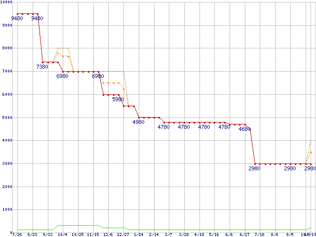 PC3-12800 1GBの価格推移↑前グラフ↓次グラフ(2008年7月26日〜2009年10月10日)※このグラフは過去のデータも税率5%相当に調整した税込み相当額のグラフです。 税率変更や、総額表示方式導入(2004年4月)の影響は除いています。●関連グラフメモリ主要製品の最安値推移1GBモジュールの最安値推移メモリ主要製品(最安値5千円未満)の最安値推移PC3-12800(DDR3-1600) DDR3 SDRAM DIMMの最安値推移●凡例最安値(点線部は販売店未確認または未調査)平均値最高値ショップ数