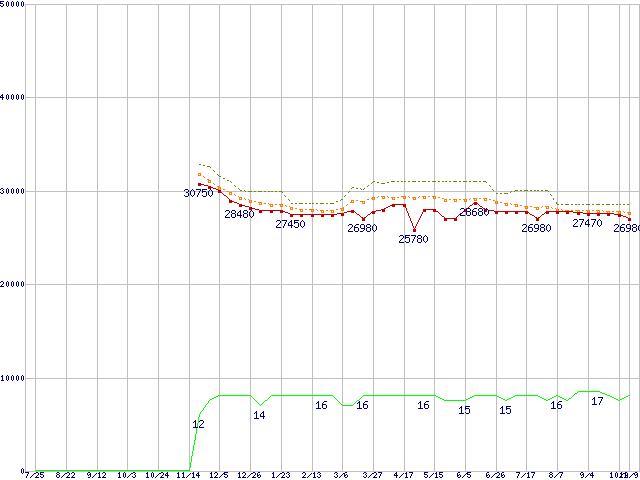 Core i7-920 (2.66GHz)の価格推移↑前グラフ↓次グラフ(2008年7月25日〜2009年10月9日)※このグラフは過去のデータも税率5%相当に調整した税込み相当額のグラフです。 税率変更や、総額表示方式導入(2004年4月)の影響は除いています。●関連グラフCPU主要製品の最安値推移CPU主要製品(最安値2万円〜3万円未満)の最安値推移Intel系CPUの最安値推移LGA1366 (QPI 4.8GT/s,L3キャッシュ8MB,Quad Core,Hyper-Threading,TDP 130W)の最安値推移●凡例最安値(点線部は販売店未確認または未調査)平均値最高値ショップ数