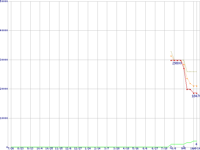 PC3-10600 4GBの価格推移↑前グラフ↓次グラフ(2008年7月26日〜2009年10月10日)※このグラフは過去のデータも税率5%相当に調整した税込み相当額のグラフです。 税率変更や、総額表示方式導入(2004年4月)の影響は除いています。●関連グラフメモリ主要製品の最安値推移4GBモジュール/2GBモジュール×2枚の最安値推移メモリ主要製品(最安値1万円以上)の最安値推移PC3-10600(DDR3-1333) DDR3 SDRAM DIMMの最安値推移●凡例最安値(点線部は販売店未確認または未調査)平均値最高値ショップ数