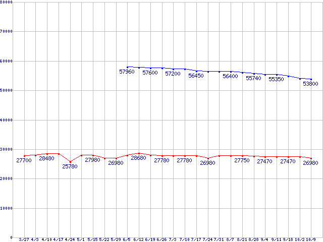 | LGA1366 (QPI 4.8GT/s,L3キャッシュ8MB,Quad Core,Hyper-Threading,TDP 130W)の最安値推移 |
