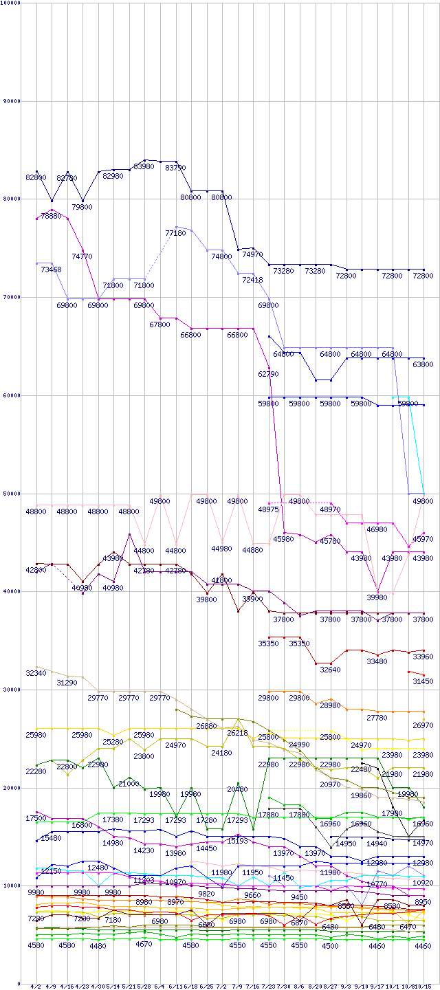 HDD/SSD主要製品の最安値推移↑前グラフ↓次グラフ(2009年4月2日〜2009年10月15日)※このグラフは過去のデータも税率5%相当に調整した税込み相当額のグラフです。 税率変更や、総額表示方式導入(2004年4月)の影響は除いています。凡例SSDSA2SH064G1C5 (64GB,SLC)2.5インチSSD(SAMSUNG製コントローラ) 256GB (256GB,MLC)2.5インチSSD(INDILINX製コントローラ) 256GB (256GB,MLC)OCZSSD2-1VTX250G (250GB,64MB,MLC)GM-25M128GSSDV5J (128GB,MLC)2.5インチSSD 256GB (256GB,MLC)SDSA2MH160G2C1/R1/R5 (160GB,MLC)SSDSA2MH160G1C5 (160GB,MLC)OCZSSD2-1VTX120G (120GB,64MB,MLC)SSDSA2SH032G1 (32GB,SLC)2.5インチSSD(SAMSUNG製コントローラ) 128GB (128GB,MLC)WD2001FASS (2TB,64MB)2.5インチSSD(INDILINX製コントローラ) 128GB (128GB,MLC)CSSD-SM128NJ2 (128GB,64MB,MLC)WD3000HLFS (300.0GB)SDSA2MH80G2C1/R1/R5 (80GB,MLC)OCZSSD2-1VTX60G (60GB,64MB,MLC)ST32000542AS (2TB,32MB)WD20EADS (2TB,32MB)2.5インチSSD 128GB (128GB,MLC)2.5インチSSD(SAMSUNG製コントローラ) 64GB (64GB,MLC)WD1500HLFS (150.0GB)HDS722020ALA330 (2TB,32MB)2.5インチSSD(INDILINX製コントローラ) 64GB (64GB,MLC)CSSD-SM64NJ2 (64GB,64MB,MLC)WD6400BEVT (640GB,8MB)WD7500KEVT (750GB,8MB,12.5mm厚)OCZSSD2-1VTX30G (30GB,64MB,MLC)2.5インチSSD 64GB (64GB,MLC)2.5インチSSD(INDILINX製コントローラ) 32GB (32GB,MLC)ST31500341AS (1.5TB,32MB)ST31500541AS (1.5TB,32MB)HD154UI (1.5TB,32MB)WD15EADS (1.5TB,32MB)WD1001FALS (1TB,32MB)2.5インチSSD 32GB (32GB,MLC)WD5000BEVT (500GB,8MB)HDT721010SLA360 (1TB,16MB)HTS545050B9A300 (500GB,8MB)ST31000528AS (1TB,32MB)ST31000520AS (1TB,32MB)WD10EADS (1TB,32MB)HD103SI (1TB,32MB)WD6400AAKS (640GB)WD3200BEVT (320GB,8MB)HTS545032B9A300 (320GB,8MB)ST3500418AS (500GB,16MB)HD502HI (500GB,16MB)※製品名をクリックすると個別のグラフを表示します※点線部は販売店が確認できなかった、または調査データがないことを示します