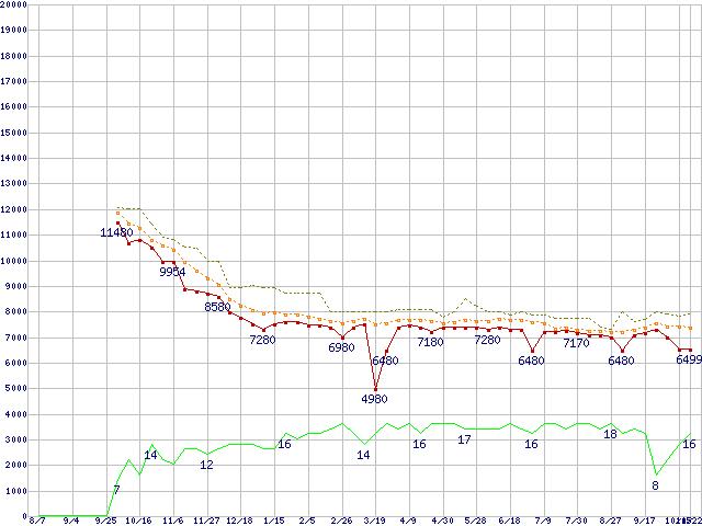 WD10EADS (1TB,32MB)の価格推移↑前グラフ↓次グラフ(2008年8月7日〜2009年10月22日)※このグラフは過去のデータも税率5%相当に調整した税込み相当額のグラフです。 税率変更や、総額表示方式導入(2004年4月)の影響は除いています。●関連グラフHDD/SSD主要製品の最安値推移HDD/SSD主要製品(最安値1万円未満)の最安値推移HDD 1TB〜1.5TB未満の最安値推移WD Caviar Green (3Gb/s)の最安値推移●凡例最安値(点線部は販売店未確認または未調査)平均値最高値ショップ数