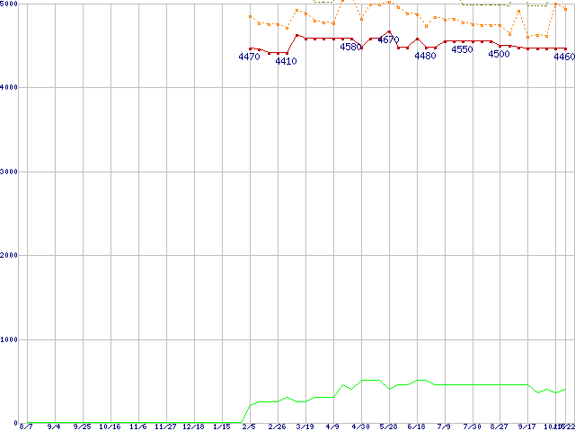 HD502HI (500GB,16MB)の価格推移↑前グラフ↓次グラフ(2008年8月7日〜2009年10月22日)※このグラフは過去のデータも税率5%相当に調整した税込み相当額のグラフです。 税率変更や、総額表示方式導入(2004年4月)の影響は除いています。●関連グラフHDD/SSD主要製品の最安値推移HDD/SSD主要製品(最安値1万円未満)の最安値推移HDD 500〜600GB未満の最安値推移EcoGreen F2 (5400rpm,3Gb/s)の最安値推移●凡例最安値(点線部は販売店未確認または未調査)平均値最高値ショップ数