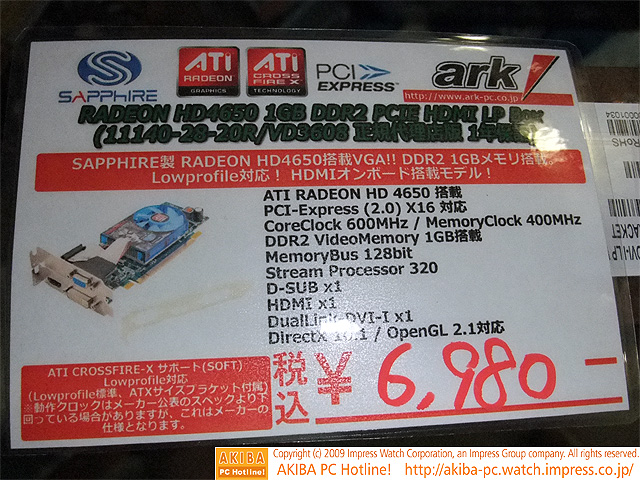 ![]() | AKIBA PC Hotline! 2009年10月24日号 今週見つけた新製品:ビデオカード [拡大画像]SAPPHIRE HD4650 1G DDR2 PCI-E HDMI/DVI-I LP W/VGA CABLE CONN. ON 2ND LP BRACKET |