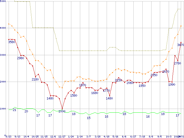 PC2-6400 2GBの価格推移↑前グラフ↓次グラフ(2008年8月23日〜2009年10月31日)※このグラフは過去のデータも税率5%相当に調整した税込み相当額のグラフです。 税率変更や、総額表示方式導入(2004年4月)の影響は除いています。●関連グラフメモリ主要製品の最安値推移2GBモジュール/1GBモジュール×2枚の最安値推移メモリ主要製品(最安値5千円未満)の最安値推移PC2-6400(DDR2-800) DDR2 SDRAM DIMMの最安値推移DDR2メモリ(2GB以下)の最安値推移●凡例最安値(点線部は販売店未確認または未調査)平均値最高値ショップ数