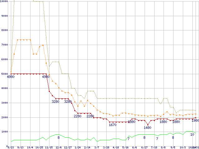 PC3-10600 1GBの価格推移↓次グラフ(2008年8月23日〜2009年10月31日)※このグラフは過去のデータも税率5%相当に調整した税込み相当額のグラフです。 税率変更や、総額表示方式導入(2004年4月)の影響は除いています。●関連グラフメモリ主要製品の最安値推移1GBモジュールの最安値推移メモリ主要製品(最安値5千円未満)の最安値推移PC3-10600(DDR3-1333) DDR3 SDRAM DIMMの最安値推移●凡例最安値(点線部は販売店未確認または未調査)平均値最高値ショップ数