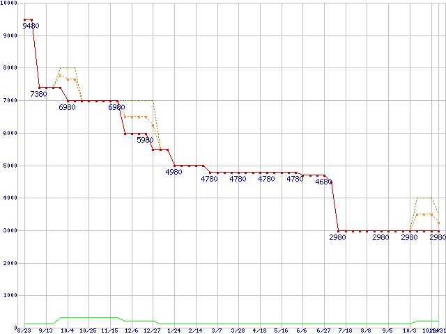 PC3-12800 1GBの価格推移↑前グラフ↓次グラフ(2008年8月23日〜2009年10月31日)※このグラフは過去のデータも税率5%相当に調整した税込み相当額のグラフです。 税率変更や、総額表示方式導入(2004年4月)の影響は除いています。●関連グラフメモリ主要製品の最安値推移1GBモジュールの最安値推移メモリ主要製品(最安値5千円未満)の最安値推移PC3-12800(DDR3-1600) DDR3 SDRAM DIMMの最安値推移●凡例最安値(点線部は販売店未確認または未調査)平均値最高値ショップ数