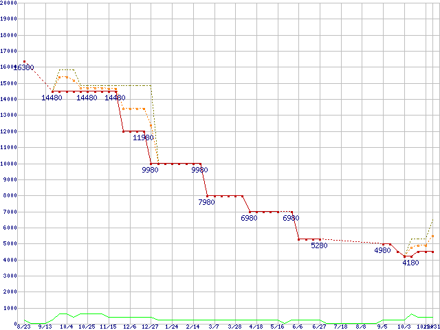 PC3-12800 2GBの価格推移↑前グラフ↓次グラフ(2008年8月23日〜2009年10月31日)※このグラフは過去のデータも税率5%相当に調整した税込み相当額のグラフです。 税率変更や、総額表示方式導入(2004年4月)の影響は除いています。●関連グラフメモリ主要製品の最安値推移2GBモジュール/1GBモジュール×2枚の最安値推移メモリ主要製品(最安値5千円未満)の最安値推移PC3-12800(DDR3-1600) DDR3 SDRAM DIMMの最安値推移●凡例最安値(点線部は販売店未確認または未調査)平均値最高値ショップ数