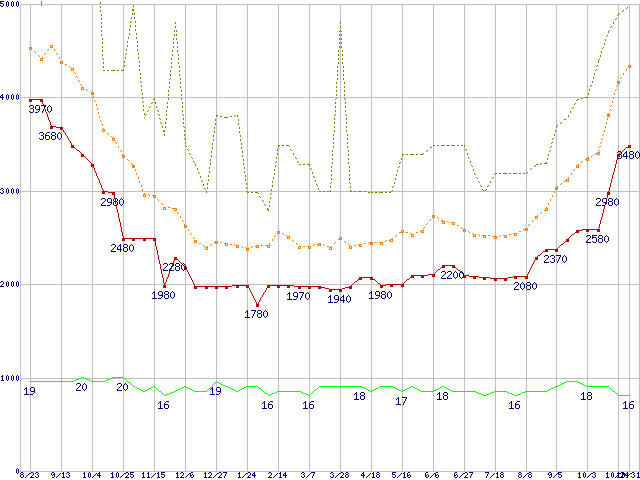 PC2-6400 1GB×2枚組みセットの価格推移↑前グラフ↓次グラフ(2008年8月23日〜2009年10月31日)※このグラフは過去のデータも税率5%相当に調整した税込み相当額のグラフです。 税率変更や、総額表示方式導入(2004年4月)の影響は除いています。●関連グラフメモリ主要製品の最安値推移2GBモジュール/1GBモジュール×2枚の最安値推移メモリ主要製品(最安値5千円未満)の最安値推移PC2-6400(DDR2-800) DDR2 SDRAM DIMMの最安値推移DDR2メモリ(2GB以下)の最安値推移●凡例最安値(点線部は販売店未確認または未調査)平均値最高値ショップ数
