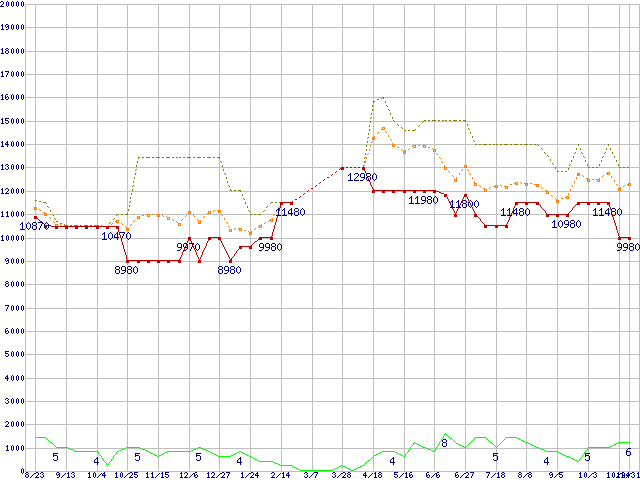 PC2-6400 4GBの価格推移↑前グラフ(2008年8月23日〜2009年10月31日)※このグラフは過去のデータも税率5%相当に調整した税込み相当額のグラフです。 税率変更や、総額表示方式導入(2004年4月)の影響は除いています。●関連グラフメモリ主要製品の最安値推移4GBモジュール/2GBモジュール×2枚の最安値推移メモリ主要製品(最安値5千円〜1万円未満)の最安値推移PC2-6400(DDR2-800) DDR2 SDRAM DIMMの最安値推移●凡例最安値(点線部は販売店未確認または未調査)平均値最高値ショップ数