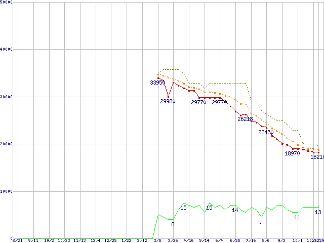 WD20EADS (2TB,32MB)の価格推移↑前グラフ(2008年8月21日〜2009年10月29日)※このグラフは過去のデータも税率5%相当に調整した税込み相当額のグラフです。 税率変更や、総額表示方式導入(2004年4月)の影響は除いています。●関連グラフHDD/SSD主要製品の最安値推移HDD/SSD主要製品(最安値1万5千円〜2万円未満)の最安値推移HDD 2TB以上の最安値推移WD Caviar Green (3Gb/s)の最安値推移●凡例最安値(点線部は販売店未確認または未調査)平均値最高値ショップ数