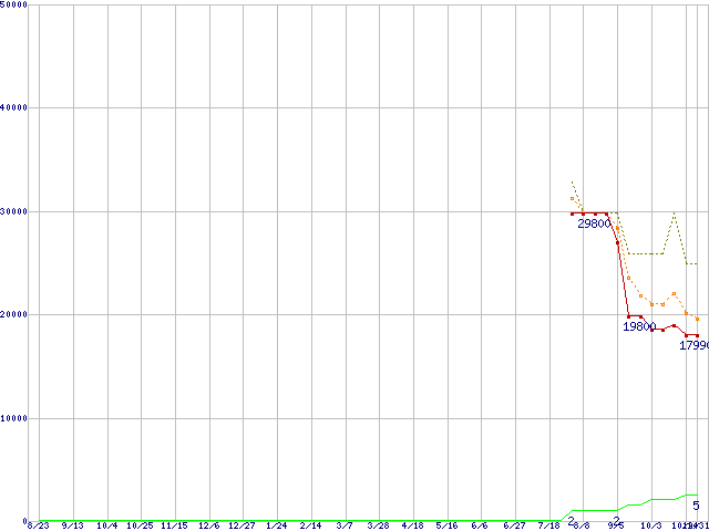 PC3-10600 4GBの価格推移↑前グラフ↓次グラフ(2008年8月23日〜2009年10月31日)※このグラフは過去のデータも税率5%相当に調整した税込み相当額のグラフです。 税率変更や、総額表示方式導入(2004年4月)の影響は除いています。●関連グラフメモリ主要製品の最安値推移4GBモジュール/2GBモジュール×2枚の最安値推移メモリ主要製品(最安値1万円以上)の最安値推移PC3-10600(DDR3-1333) DDR3 SDRAM DIMMの最安値推移●凡例最安値(点線部は販売店未確認または未調査)平均値最高値ショップ数