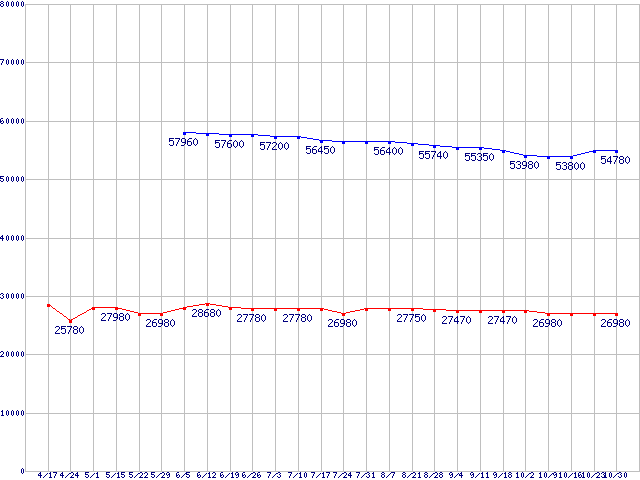 | LGA1366 (QPI 4.8GT/s,L3キャッシュ8MB,Quad Core,Hyper-Threading,TDP 130W)の最安値推移 |