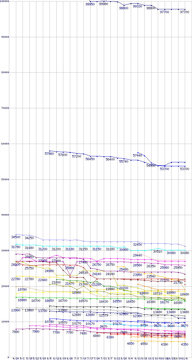 CPU主要製品の最安値推移↑前グラフ↓次グラフ(2009年4月24日〜2009年11月6日)※このグラフは過去のデータも税率5%相当に調整した税込み相当額のグラフです。 税率変更や、総額表示方式導入(2004年4月)の影響は除いています。凡例Core i7-975 Extreme Edition (3.33GHz)Core i7-950 (3.06GHz)Core i7-870 (2.93GHz)Core 2 Quad Q9550S (2.83GHz,L2 6MB×2)Core 2 Quad Q9650 (3.00GHz,L2 6MB×2)Core i7-860 (2.80GHz)Core i7-920 (2.66GHz)Core 2 Duo E8600 (3.33GHz,L2 6MB)Core 2 Quad Q9400S (2.66GHz,L2 3MB×2)Core 2 Quad Q9550 (2.83GHz,L2 6MB×2)Core 2 Quad Q8400S (2.66GHz,L2 2MB×2)Phenom II X4 965 Black Edition (3.4GHz,L2 512KB×4,L3 6MB,TDP 125W)Core i5-750 (2.66GHz)Phenom II X4 965 Black Edition (3.4GHz,L2 512KB×4,L3 6MB,TDP 140W)Core 2 Quad Q9400 (2.66GHz,L2 3MB×2)Core 2 Duo E8500 (3.16GHz,L2 6MB)Phenom II X4 955 Black Edition (3.2GHz,L2 512KB×4,L3 6MB,TDP 125W)Phenom II X4 905e (2.5GHz,L2 512KB×4,L3 6MB,TDP 65W)Core 2 Quad Q8400 (2.66GHz,L2 2MB×2)Phenom II X4 945 (3.0GHz,L2 512KB×4,L3 6MB,TDP 95W)Core 2 Duo E8400 (3GHz,L2 6MB)Athlon II X4 605e (2.3GHz,L2 512KB×4,TDP 45W)Core 2 Duo E7600 (3.06GHz,L2 3MB)Athlon II X4 630 (2.8GHz,L2 512KB×4,TDP 95W)Phenom II X3 720 Black Edition (2.8GHz,L2 512KB×3,L3 6MB,TDP 95W)Core 2 Duo E7500 (2.93GHz,L2 3MB)Phenom II X3 705e (2.5GHz,L2 512KB×3,L3 6MB,TDP 65W)Athlon II X4 620 (2.6GHz,L2 512KB×4,TDP 95W)Phenom II X2 550 Black Edition (3.1GHz,L2 512KB×2,L3 6MB)Pentium Dual-Core E6500 (2.93GHz,L2 2MB)Phenom II X2 545 (3.0GHz,L2 512KB×2,L3 6MB)Athlon II X2 240e (2.8GHz,L2 1MB×2,TDP 45W)Pentium Dual-Core E6300 (2.8GHz,L2 2MB)Athlon II X2 250 (3.0GHz,L2 1MB×2,TDP 65W)Pentium Dual-Core E5300 (2.6GHz,L2 2MB)Athlon II X2 235e (2.7GHz,L2 1MB×2,TDP 45W)Athlon II X2 245 (2.9GHz,L2 1MB×2,TDP 65W)Athlon II X2 240 (2.8GHz,L2 1MB×2,TDP 65W)Celeron E3300 (2.5GHz)Celeron E3200 (2.4GHz)※製品名をクリックすると個別のグラフを表示します※点線部は販売店が確認できなかった、または調査データがないことを示します