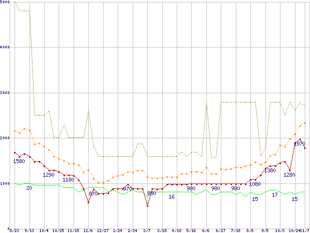 PC2-6400 1GBの価格推移↑前グラフ↓次グラフ(2008年8月23日〜2009年11月7日)※このグラフは過去のデータも税率5%相当に調整した税込み相当額のグラフです。 税率変更や、総額表示方式導入(2004年4月)の影響は除いています。●関連グラフメモリ主要製品の最安値推移1GBモジュールの最安値推移メモリ主要製品(最安値5千円未満)の最安値推移PC2-6400(DDR2-800) DDR2 SDRAM DIMMの最安値推移●凡例最安値(点線部は販売店未確認または未調査)平均値最高値ショップ数