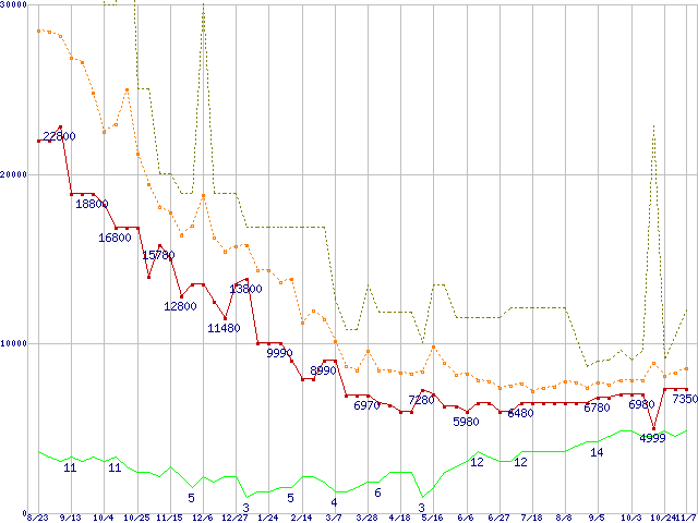 PC3-10600 2GB×2枚組みセットの価格推移↑前グラフ↓次グラフ(2008年8月23日〜2009年11月7日)※このグラフは過去のデータも税率5%相当に調整した税込み相当額のグラフです。 税率変更や、総額表示方式導入(2004年4月)の影響は除いています。●関連グラフメモリ主要製品の最安値推移4GBモジュール/2GBモジュール×2枚の最安値推移メモリ主要製品(最安値5千円〜1万円未満)の最安値推移PC3-10600(DDR3-1333) DDR3 SDRAM DIMMの最安値推移2GB×2枚組みセットの最安値推移●凡例最安値(点線部は販売店未確認または未調査)平均値最高値ショップ数