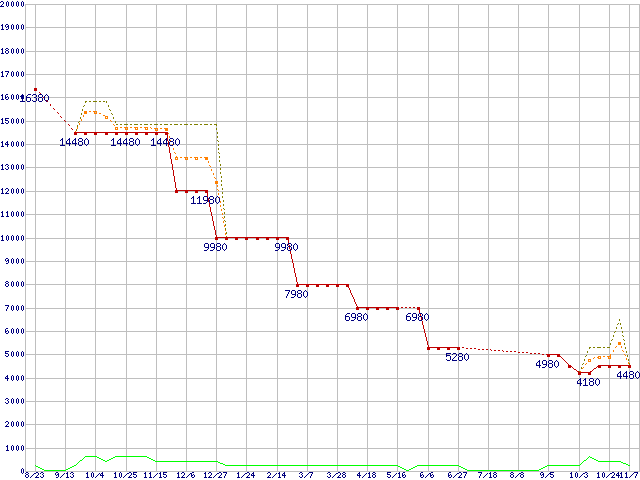 PC3-12800 2GBの価格推移↑前グラフ↓次グラフ(2008年8月23日〜2009年11月7日)※このグラフは過去のデータも税率5%相当に調整した税込み相当額のグラフです。 税率変更や、総額表示方式導入(2004年4月)の影響は除いています。●関連グラフメモリ主要製品の最安値推移2GBモジュール/1GBモジュール×2枚の最安値推移メモリ主要製品(最安値5千円未満)の最安値推移PC3-12800(DDR3-1600) DDR3 SDRAM DIMMの最安値推移●凡例最安値(点線部は販売店未確認または未調査)平均値最高値ショップ数
