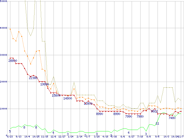 PC3-12800 2GB×2枚組みセットの価格推移↑前グラフ↓次グラフ(2008年8月23日〜2009年11月7日)※このグラフは過去のデータも税率5%相当に調整した税込み相当額のグラフです。 税率変更や、総額表示方式導入(2004年4月)の影響は除いています。●関連グラフメモリ主要製品の最安値推移4GBモジュール/2GBモジュール×2枚の最安値推移メモリ主要製品(最安値5千円〜1万円未満)の最安値推移PC3-12800(DDR3-1600) DDR3 SDRAM DIMMの最安値推移2GB×2枚組みセットの最安値推移●凡例最安値(点線部は販売店未確認または未調査)平均値最高値ショップ数