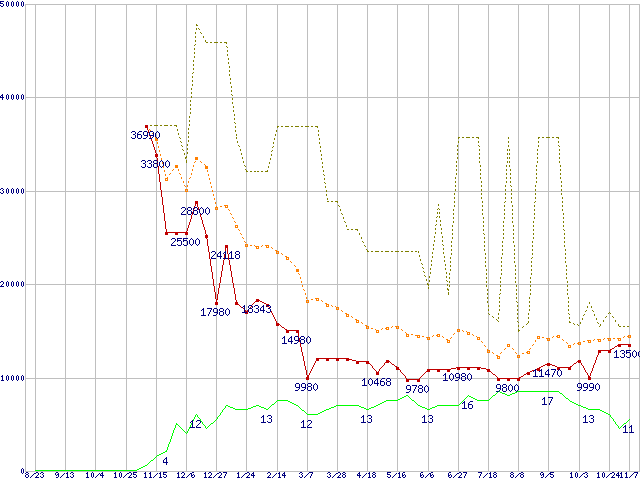 PC3-12800 2GB×3枚組みセットの価格推移↑前グラフ↓次グラフ(2008年8月23日〜2009年11月7日)※このグラフは過去のデータも税率5%相当に調整した税込み相当額のグラフです。 税率変更や、総額表示方式導入(2004年4月)の影響は除いています。●関連グラフメモリ主要製品の最安値推移メモリ主要製品(最安値1万円以上)の最安値推移PC3-12800(DDR3-1600) DDR3 SDRAM DIMMの最安値推移●凡例最安値(点線部は販売店未確認または未調査)平均値最高値ショップ数