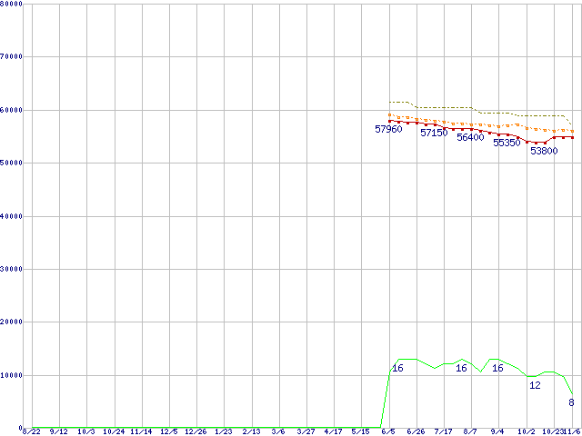 Core i7-950 (3.06GHz)の価格推移↑前グラフ↓次グラフ(2008年8月22日〜2009年11月6日)※このグラフは過去のデータも税率5%相当に調整した税込み相当額のグラフです。 税率変更や、総額表示方式導入(2004年4月)の影響は除いています。●関連グラフCPU主要製品の最安値推移CPU主要製品(最安値3万円〜6万円未満)の最安値推移Intel系CPUの最安値推移LGA1366 (QPI 4.8GT/s,L3キャッシュ8MB,Quad Core,Hyper-Threading,TDP 130W)の最安値推移●凡例最安値(点線部は販売店未確認または未調査)平均値最高値ショップ数