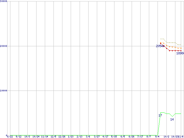 Core i5-750 (2.66GHz)の価格推移↓次グラフ(2008年8月22日〜2009年11月6日)※このグラフは過去のデータも税率5%相当に調整した税込み相当額のグラフです。 税率変更や、総額表示方式導入(2004年4月)の影響は除いています。●関連グラフCPU主要製品の最安値推移CPU主要製品(最安値1万円〜2万円未満)の最安値推移Intel系CPUの最安値推移LGA1156 (L3キャッシュ8MB,Quad Core,TDP 95W)の最安値推移●凡例最安値(点線部は販売店未確認または未調査)平均値最高値ショップ数