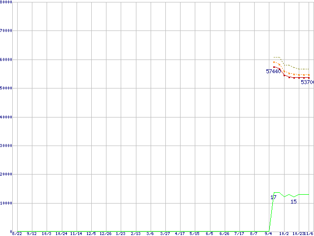 Core i7-870 (2.93GHz)の価格推移↑前グラフ↓次グラフ(2008年8月22日〜2009年11月6日)※このグラフは過去のデータも税率5%相当に調整した税込み相当額のグラフです。 税率変更や、総額表示方式導入(2004年4月)の影響は除いています。●関連グラフCPU主要製品の最安値推移CPU主要製品(最安値3万円〜6万円未満)の最安値推移Intel系CPUの最安値推移LGA1156 (L3キャッシュ8MB,Quad Core,Hyper-Threading,TDP 95W)の最安値推移●凡例最安値(点線部は販売店未確認または未調査)平均値最高値ショップ数