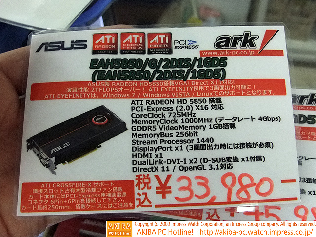 AKIBA PC Hotline! 2009年11月7日号今週見つけた新製品:ビデオカード ASUS EAH5870/G/2DIS/1GD5 ASUS EAH5850/G/2DIS/1GD5前の画像←→次の画像