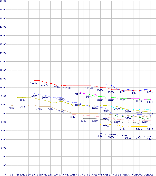 CPU主要製品(最安値1万円未満)の最安値推移↑前グラフ↓次グラフ(2009年5月1日〜2009年11月13日)※このグラフは過去のデータも税率5%相当に調整した税込み相当額のグラフです。 税率変更や、総額表示方式導入(2004年4月)の影響は除いています。凡例Athlon II X4 620 (2.6GHz,L2 512KB×4,TDP 95W)Phenom II X2 550 Black Edition (3.1GHz,L2 512KB×2,L3 6MB)Pentium Dual-Core E6500 (2.93GHz,L2 2MB)Phenom II X2 545 (3.0GHz,L2 512KB×2,L3 6MB)Athlon II X2 240e (2.8GHz,L2 1MB×2,TDP 45W)Pentium Dual-Core E6300 (2.8GHz,L2 2MB)Athlon II X2 250 (3.0GHz,L2 1MB×2,TDP 65W)Pentium Dual-Core E5300 (2.6GHz,L2 2MB)Athlon II X2 235e (2.7GHz,L2 1MB×2,TDP 45W)Athlon II X2 245 (2.9GHz,L2 1MB×2,TDP 65W)Athlon II X2 240 (2.8GHz,L2 1MB×2,TDP 65W)Celeron E3300 (2.5GHz)Celeron E3200 (2.4GHz)※製品名をクリックすると個別のグラフを表示します※点線部は販売店が確認できなかった、または調査データがないことを示します