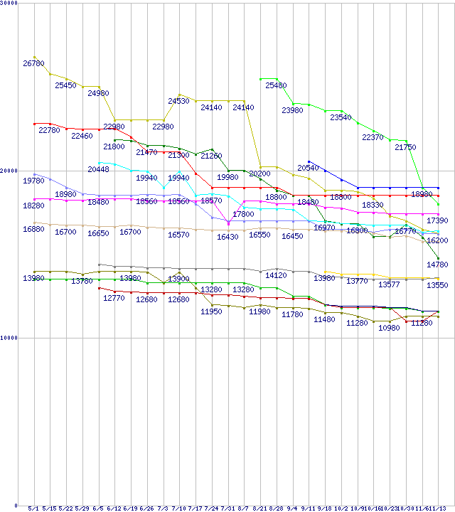 | CPU主要製品(最安値1万円〜2万円未満)の最安値推移 |