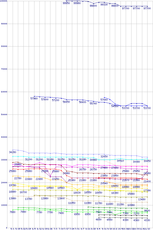 Intel系CPUの最安値推移↑前グラフ↓次グラフ(2009年5月1日〜2009年11月13日)※このグラフは過去のデータも税率5%相当に調整した税込み相当額のグラフです。 税率変更や、総額表示方式導入(2004年4月)の影響は除いています。凡例Core i7-975 Extreme Edition (3.33GHz)Core i7-950 (3.06GHz)Core i7-870 (2.93GHz)Core 2 Quad Q9550S (2.83GHz,L2 6MB×2)Core 2 Quad Q9650 (3.00GHz,L2 6MB×2)Core i7-860 (2.80GHz)Core i7-920 (2.66GHz)Core 2 Duo E8600 (3.33GHz,L2 6MB)Core 2 Quad Q9550 (2.83GHz,L2 6MB×2)Core 2 Quad Q9400S (2.66GHz,L2 3MB×2)Core 2 Quad Q9505 (2.83GHz,L2 3MB×2)Core 2 Quad Q8400S (2.66GHz,L2 2MB×2)Core i5-750 (2.66GHz)Core 2 Quad Q9400 (2.66GHz,L2 3MB×2)Core 2 Duo E8500 (3.16GHz,L2 6MB)Core 2 Quad Q8400 (2.66GHz,L2 2MB×2)Core 2 Duo E8400 (3GHz,L2 6MB)Core 2 Duo E7600 (3.06GHz,L2 3MB)Core 2 Duo E7500 (2.93GHz,L2 3MB)Pentium Dual-Core E6500 (2.93GHz,L2 2MB)Pentium Dual-Core E6300 (2.8GHz,L2 2MB)Pentium Dual-Core E5300 (2.6GHz,L2 2MB)Celeron E3300 (2.5GHz)Celeron E3200 (2.4GHz)※製品名をクリックすると個別のグラフを表示します※点線部は販売店が確認できなかった、または調査データがないことを示します