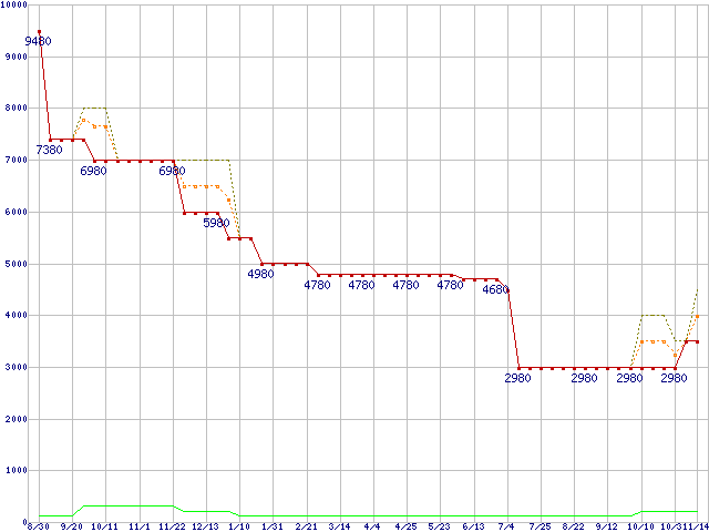PC3-12800 1GBの価格推移↑前グラフ↓次グラフ(2008年8月30日〜2009年11月14日)※このグラフは過去のデータも税率5%相当に調整した税込み相当額のグラフです。 税率変更や、総額表示方式導入(2004年4月)の影響は除いています。●関連グラフメモリ主要製品の最安値推移1GBモジュールの最安値推移メモリ主要製品(最安値5千円未満)の最安値推移PC3-12800(DDR3-1600) DDR3 SDRAM DIMMの最安値推移●凡例最安値(点線部は販売店未確認または未調査)平均値最高値ショップ数