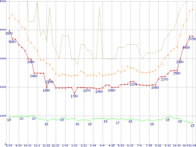 PC2-6400 1GB×2枚組みセットの価格推移↑前グラフ↓次グラフ(2008年8月30日〜2009年11月14日)※このグラフは過去のデータも税率5%相当に調整した税込み相当額のグラフです。 税率変更や、総額表示方式導入(2004年4月)の影響は除いています。●関連グラフメモリ主要製品の最安値推移2GBモジュール/1GBモジュール×2枚の最安値推移メモリ主要製品(最安値5千円未満)の最安値推移PC2-6400(DDR2-800) DDR2 SDRAM DIMMの最安値推移●凡例最安値(点線部は販売店未確認または未調査)平均値最高値ショップ数