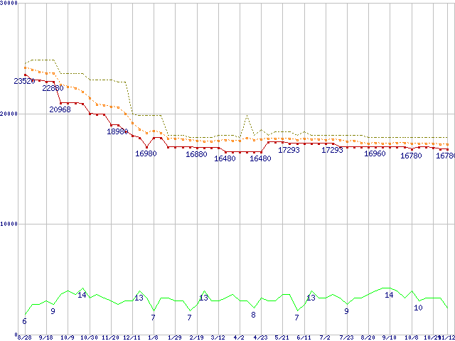 WD1500HLFS (150.0GB)の価格推移↑前グラフ↓次グラフ(2008年8月28日〜2009年11月12日)※このグラフは過去のデータも税率5%相当に調整した税込み相当額のグラフです。 税率変更や、総額表示方式導入(2004年4月)の影響は除いています。●関連グラフHDD/SSD主要製品の最安値推移HDD/SSD主要製品(最安値1万5千円〜2万円未満)の最安値推移HDD 100〜160GB未満の最安値推移WD VelociRaptor (10000rpm,3Gb/s,16MB)の最安値推移●凡例最安値(点線部は販売店未確認または未調査)平均値最高値ショップ数