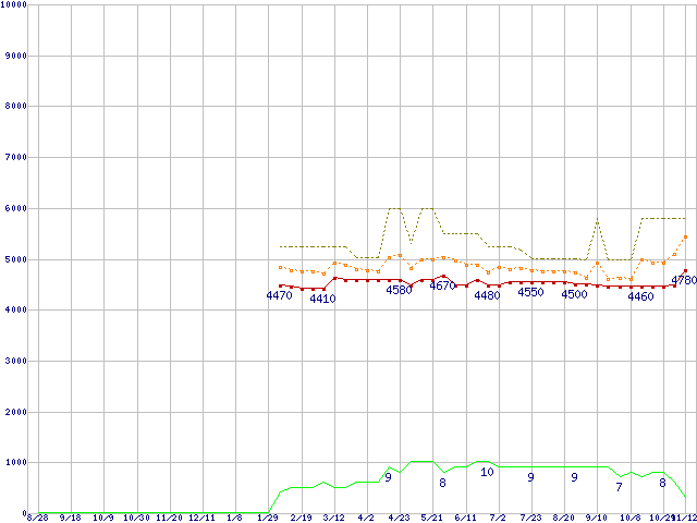 HD502HI (500GB,16MB)の価格推移↑前グラフ↓次グラフ(2008年8月28日〜2009年11月12日)※このグラフは過去のデータも税率5%相当に調整した税込み相当額のグラフです。 税率変更や、総額表示方式導入(2004年4月)の影響は除いています。●関連グラフHDD/SSD主要製品の最安値推移HDD/SSD主要製品(最安値1万円未満)の最安値推移HDD 500〜600GB未満の最安値推移EcoGreen F2 (5400rpm,3Gb/s)の最安値推移●凡例最安値(点線部は販売店未確認または未調査)平均値最高値ショップ数