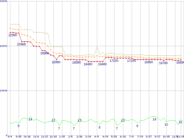 WD1500HLFS (150.0GB)の価格推移↑前グラフ↓次グラフ(2008年9月4日〜2009年11月19日)※このグラフは過去のデータも税率5%相当に調整した税込み相当額のグラフです。 税率変更や、総額表示方式導入(2004年4月)の影響は除いています。●関連グラフHDD/SSD主要製品の最安値推移HDD/SSD主要製品(最安値1万5千円〜2万円未満)の最安値推移HDD 100〜160GB未満の最安値推移WD VelociRaptor (10000rpm,3Gb/s,16MB)の最安値推移●凡例最安値(点線部は販売店未確認または未調査)平均値最高値ショップ数