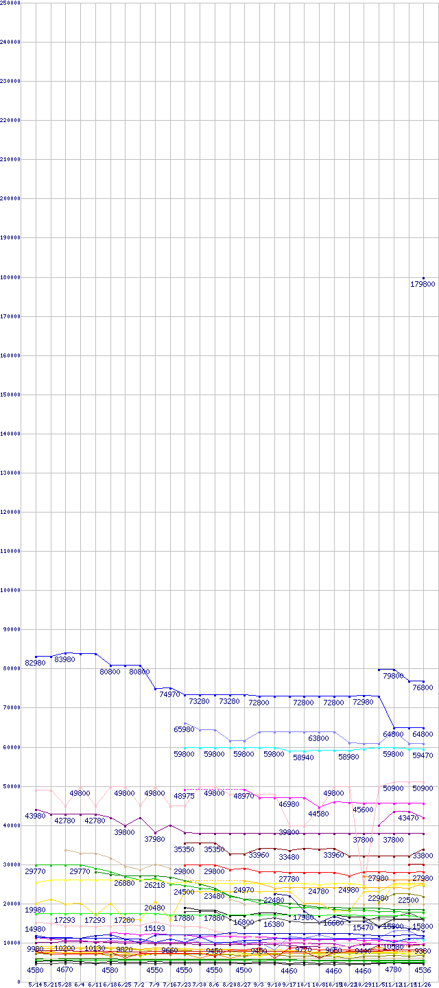 HDD/SSD主要製品の最安値推移↑前グラフ↓次グラフ(2009年5月14日〜2009年11月26日)※このグラフは過去のデータも税率5%相当に調整した税込み相当額のグラフです。 税率変更や、総額表示方式導入(2004年4月)の影響は除いています。凡例2.5インチSSD(東芝製コントローラ) 512GB (512GB,MLC)2.5インチSSD(東芝製コントローラ) 256GB (256GB,MLC)SSDSA2SH064G1C5 (64GB,SLC)2.5インチSSD(SAMSUNG製コントローラ) 256GB (256GB,MLC)2.5インチSSD(INDILINX製コントローラ) 256GB (256GB,MLC)2.5インチSSD 256GB (256GB,MLC)SDSA2MH160G2C1/R1/R5 (160GB,MLC)2.5インチSSD(東芝製コントローラ) 128GB (128GB,MLC)SSDSA2SH032G1 (32GB,SLC)2.5インチSSD(SAMSUNG製コントローラ) 128GB (128GB,MLC)ST32000641AS (2TB,64MB)2.5インチSSD(INDILINX製コントローラ) 128GB (128GB,MLC)2.5インチSSD(JMicron JMF612搭載) 128GB (128GB,MLC)SDSA2MH80G2C1/R1/R5 (80GB,MLC)2.5インチSSD 128GB (128GB,MLC)WD3000HLFS (300.0GB)ASINTS-80GM-CSA (80GB,MLC)2.5インチSSD(東芝製コントローラ) 64GB (64GB,MLC)X25-M(6526-080GR101B) (80GB,MLC)ST32000542AS (2TB,32MB)WD20EADS (2TB,32MB)WD1500HLFS (150.0GB)2.5インチSSD(SAMSUNG製コントローラ) 64GB (64GB,MLC)2.5インチSSD(INDILINX製コントローラ) 64GB (64GB,MLC)2.5インチSSD(JMicron JMF612搭載) 64GB (64GB,MLC)WD6400BEVT (640GB,8MB)HDS722020ALA330 (2TB,32MB)2.5インチSSD 64GB (64GB,MLC)ST31500341AS (1.5TB,32MB)2.5インチSSD(INDILINX製コントローラ) 32GB (32GB,MLC)SNV125-S2・S2BD/40GB (40GB,MLC)WD15EADS (1.5TB,32MB)ST31500541AS (1.5TB,32MB)HD154UI (1.5TB,32MB)WD1001FALS (1TB,32MB)HDS721010CLA332 (1TB,32MB)ST31000528AS (1TB,32MB)2.5インチSSD 32GB (32GB,MLC)HDT721010SLA360 (1TB,16MB)HTS545050B9A300 (500GB,8MB)WD5000BEVT (500GB,8MB)WD10EADS (1TB,32MB)ST31000520AS (1TB,32MB)HD103SI (1TB,32MB)WD6400AAKS (640GB)WD3200BEVT (320GB,8MB)HTS545032B9A300 (320GB,8MB)HDS721050CLA362 (500GB,16MB)ST3500418AS (500GB,16MB)HD502HI (500GB,16MB)※製品名をクリックすると個別のグラフを表示します※点線部は販売店が確認できなかった、または調査データがないことを示します