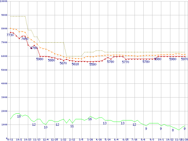 WD6400AAKS (640GB)の価格推移↑前グラフ↓次グラフ(2008年9月11日〜2009年11月26日)※このグラフは過去のデータも税率5%相当に調整した税込み相当額のグラフです。 税率変更や、総額表示方式導入(2004年4月)の影響は除いています。●関連グラフHDD/SSD主要製品の最安値推移HDD/SSD主要製品(最安値1万円未満)の最安値推移HDD 600〜750GB未満の最安値推移WD Caviar Blue (7200rpm,3Gb/s,16MB)の最安値推移●凡例最安値(点線部は販売店未確認または未調査)平均値最高値ショップ数